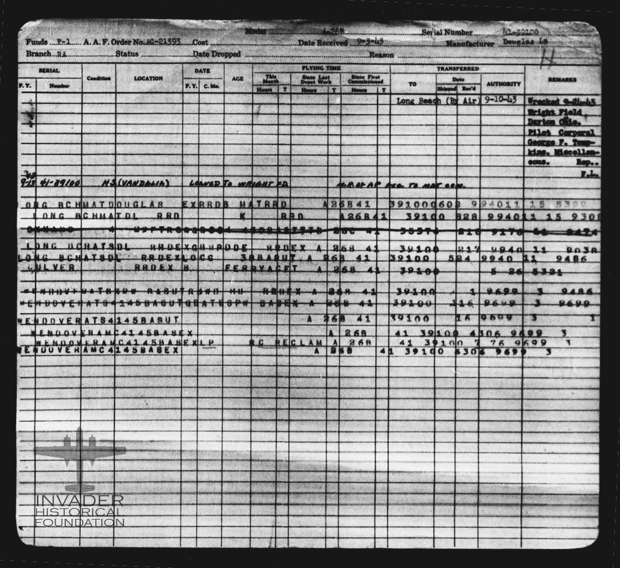 The Individual Aircraft Record Card for 41-39100 from the USAFHRA archives.