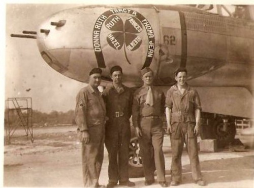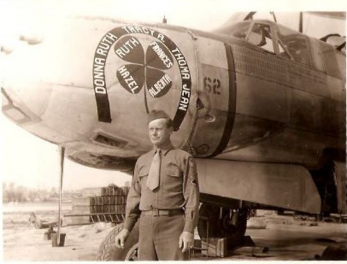 Crew Chief - Al Brewer (pictured here). The names are Brewer's wife, Ruth, and 3 daughters on clover. Brewer's 2 granddaughters and grandson are listed on horse shoe. Information about nose art and photo from Brewer's granddaughter, Donna Ruth Brenneis.