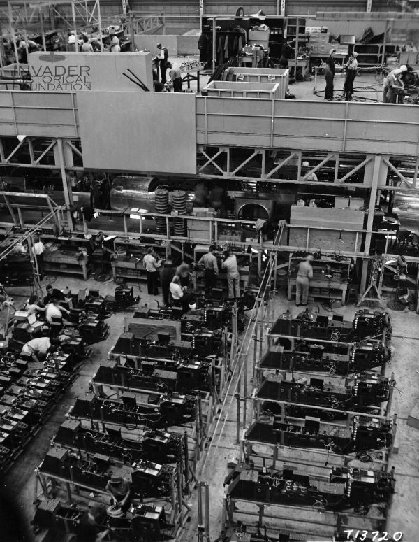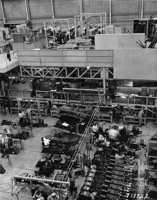 The two planes fuselages shown here are 400 (43-22651) (left) and 401 (43-22652) (right). Workers on the factory floor build cockpit components at Douglas Tulsa.