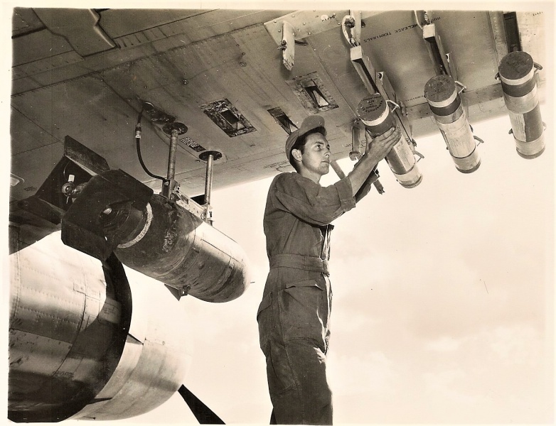 Armorer Marvin Lutnesky mounts flare launchers for a night mission next to a 500 lbs bomb during the Korean War. Photo from Gary Lutnesky