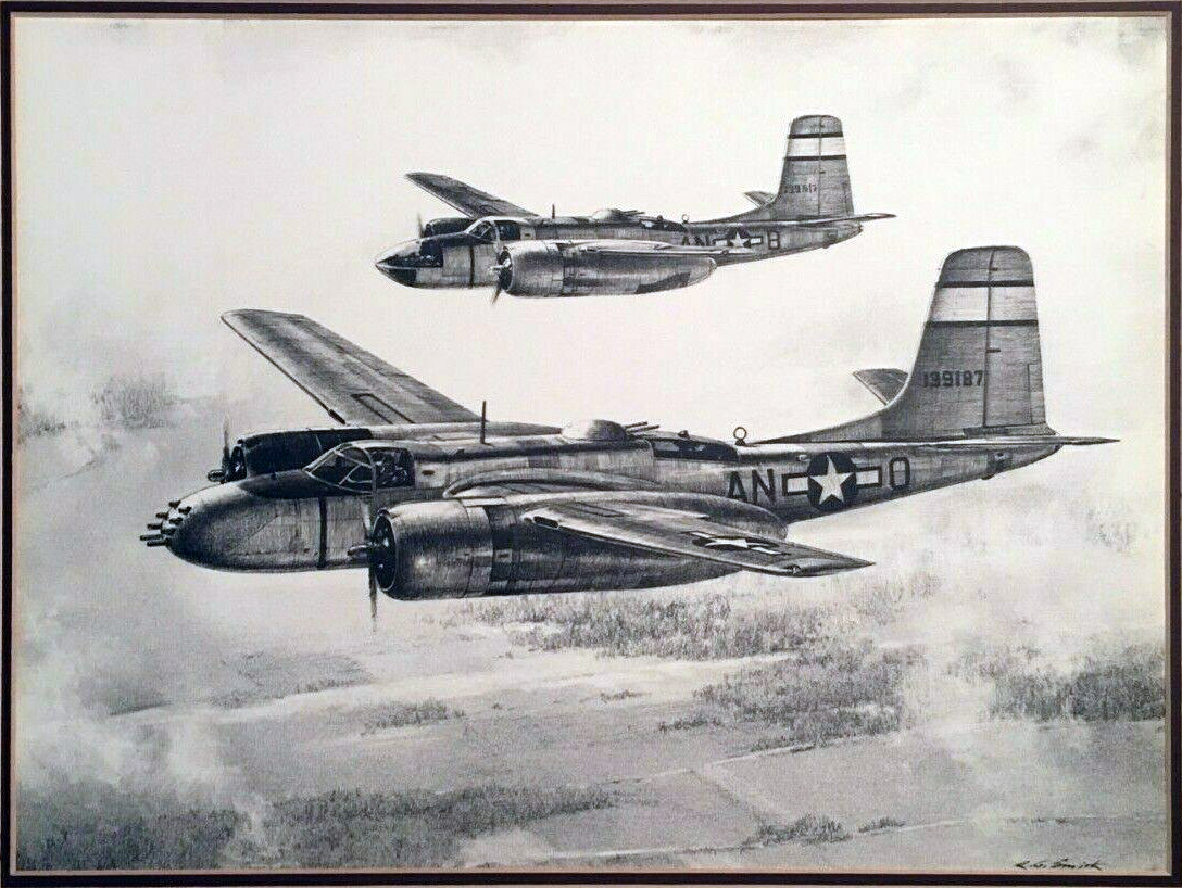 A drawing by the notable R. G. Smith depicting two planes of the 553rd Bombardment Squadron, 386th Bombardment Group. Image is copyrighted R. G. Smith.