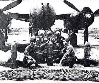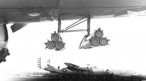 A 13th Bomb Squadron Invader (Tail Letter W) is being equipped with training Rockets prior to a mission at Yokota Air Base, Japan in July, 1948. Note how skinny these rockets are compared to the standard 5" rockets pictured above. These training rockets are 2.5" Sub-Caliber Aircraft Rockets (SCAR) and helped pilots learn targeting and firing.