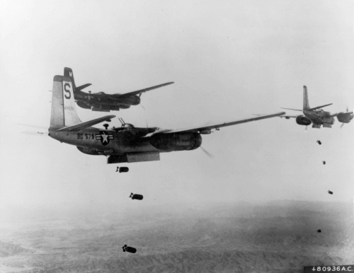 An Invader from the 3rd Bombardment Group drops a napalm bomb on enemy ground forces during 1952.