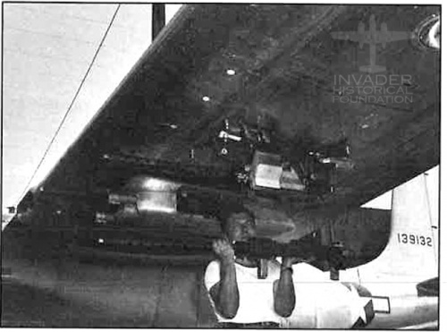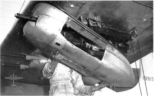Invaders that were supposed to go to the 5th Air Force in the Pacific had the ventral turret removed in favor of an additional 125-gallon fuel tank. The Ventral Turret is pictured below. The gunner's periscope sight can be seen in the glass bubble.