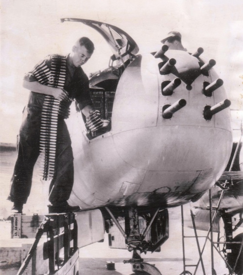 An armament technician loads an 8-gun Invader in Korea.