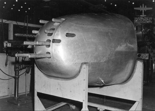 The first production Invaders were built with a 75mm cannon in the nose. A very small number of Invaders were actually produced at the factory with this configuration. Production block 1 (5 planes) and block 5 - Long Beach (15 planes), and Production Block 5 - Tulsa (10 planes) were built with this nose. By production block 15, the nose was altered to be a swappable "general purpose" nose. Officially there are no reports of this cannon being used in combat. Unofficially, I've heard unverified tales of at least one plane in Korea that was equipped with such a nose specifically to combat trains hiding in tunnels.