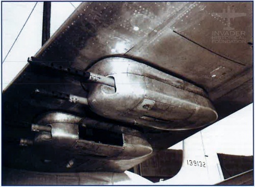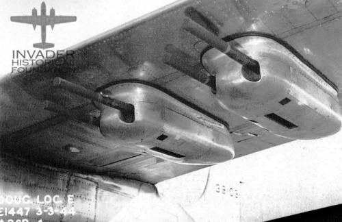 Invaders could also be equipped with underwing gun pods. Each pod carried 2x .50 caliber machine guns, allowing the plane to carry an additional 8 machine guns, in addition to the nose guns.