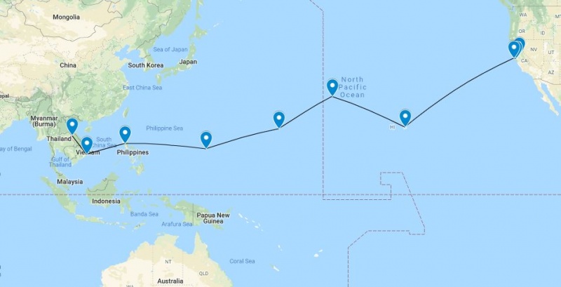 A Google Map showing Frank Nelson's Flight Across the Pacific.