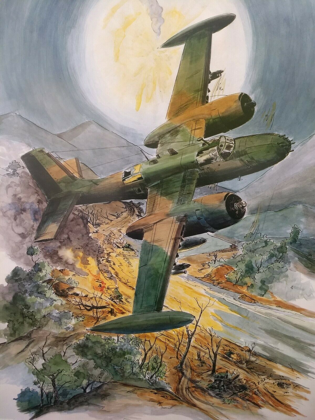 A painting depicting a B-26K of the 609th Special Operations Squadron on mission in Vietnam. Painting by a pilot of these planes, John Jack Krause. Only 999 of these paintings were produced. The IHF has #169 in our collection. This image comes from our copy. Copyright John Jack Krause.