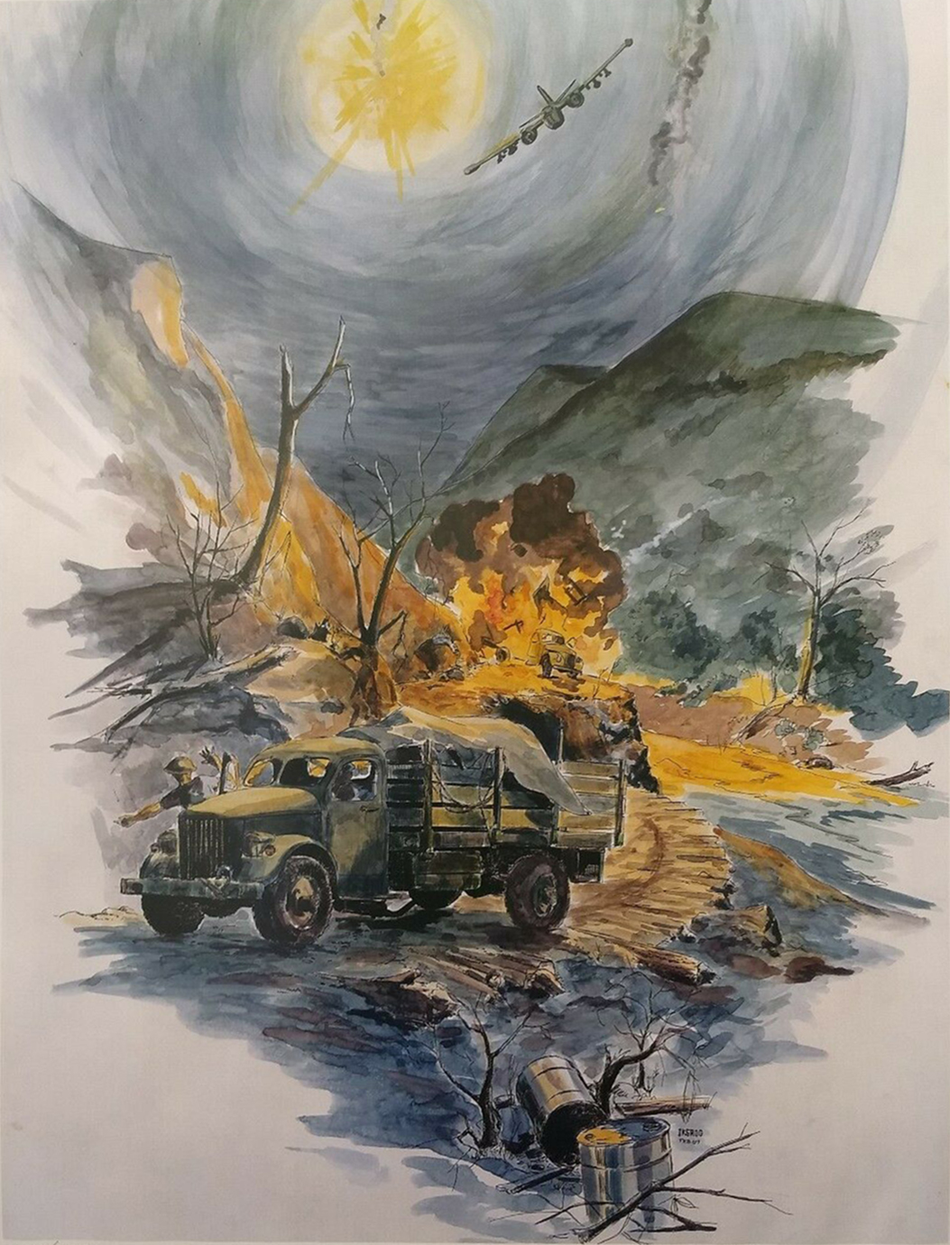 A painting depicting a B-26K of the 609th Special Operations Squadron on mission in Vietnam. Painting by a pilot of these planes, John Jack Krause. Only 999 of these paintings were produced. The IHF has #169 in our collection. This image comes from our copy. Copyright John Jack Krause.