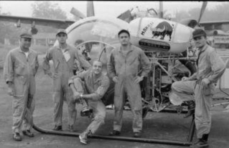 Members of the Makasi Squadron stand next to a Bell 47 Helicopter adorned with the Squadron Insignia.
