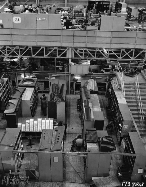 The two fuselages under the spine are 398 (43-22649) (left) and 399 (43-22650) (right) at the Douglas Tulsa factory.
